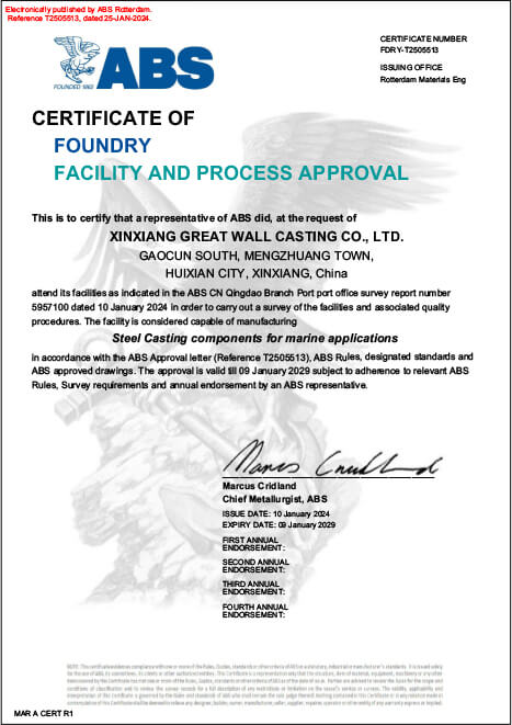 新乡长城铸钢可定制单重150t以下ZG35CrMo、ZG42CrMo等各类碳钢、合金钢材质的船用铸钢件,质量UT满足EN12680.1-1或GB/T7233-2009的2级要求;MT满足GB/T9444-2016的1级要求,并且获得CCS/DNV/ABS/NK等多家船级社相关资质认证,产品质量稳定、可靠,已为国内多家船厂及配套企业提供铸钢件。
